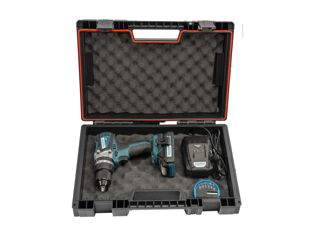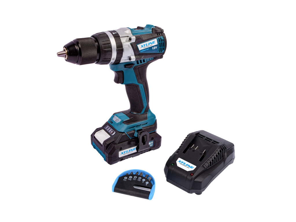 XTLINE Aku vrtačka s příklepem bezuhlíková 18 V, 65 Nm + baterie 2.0 Ah + nabíječka 2.4 A + sada bitů 7 dílů + box
