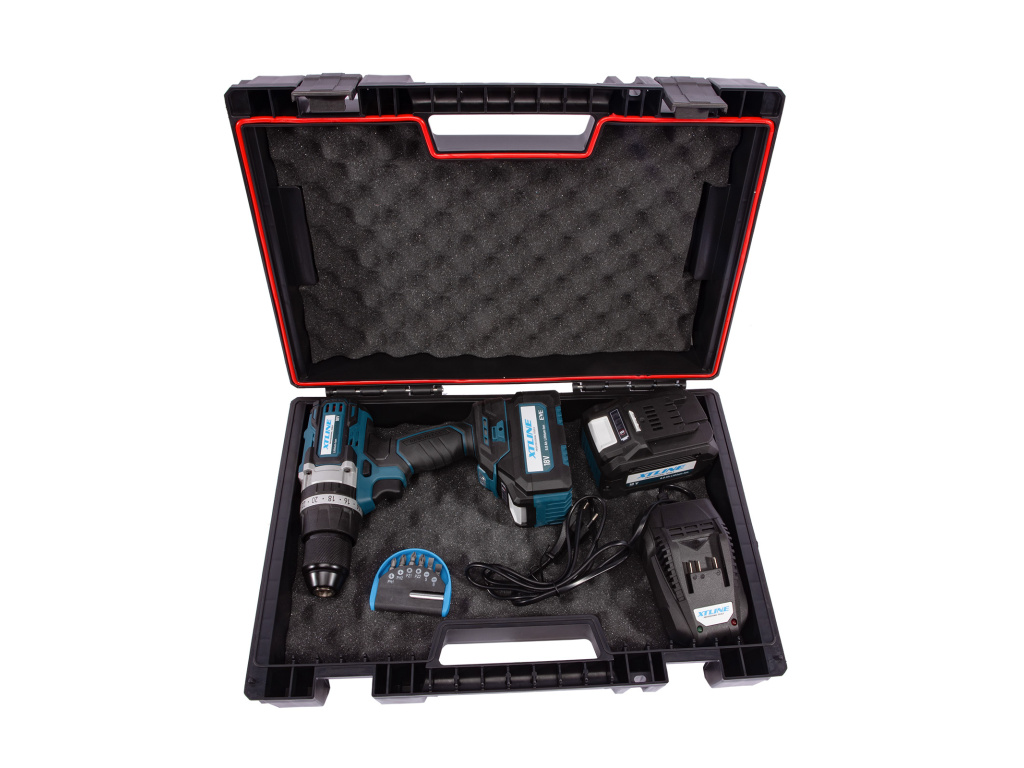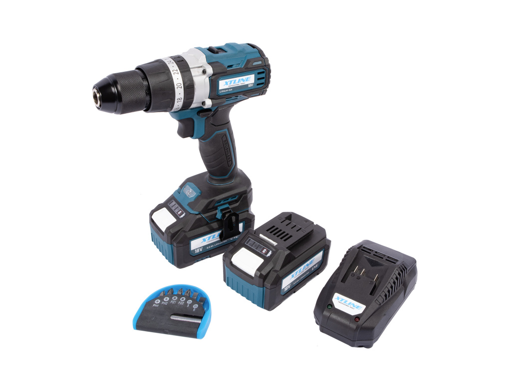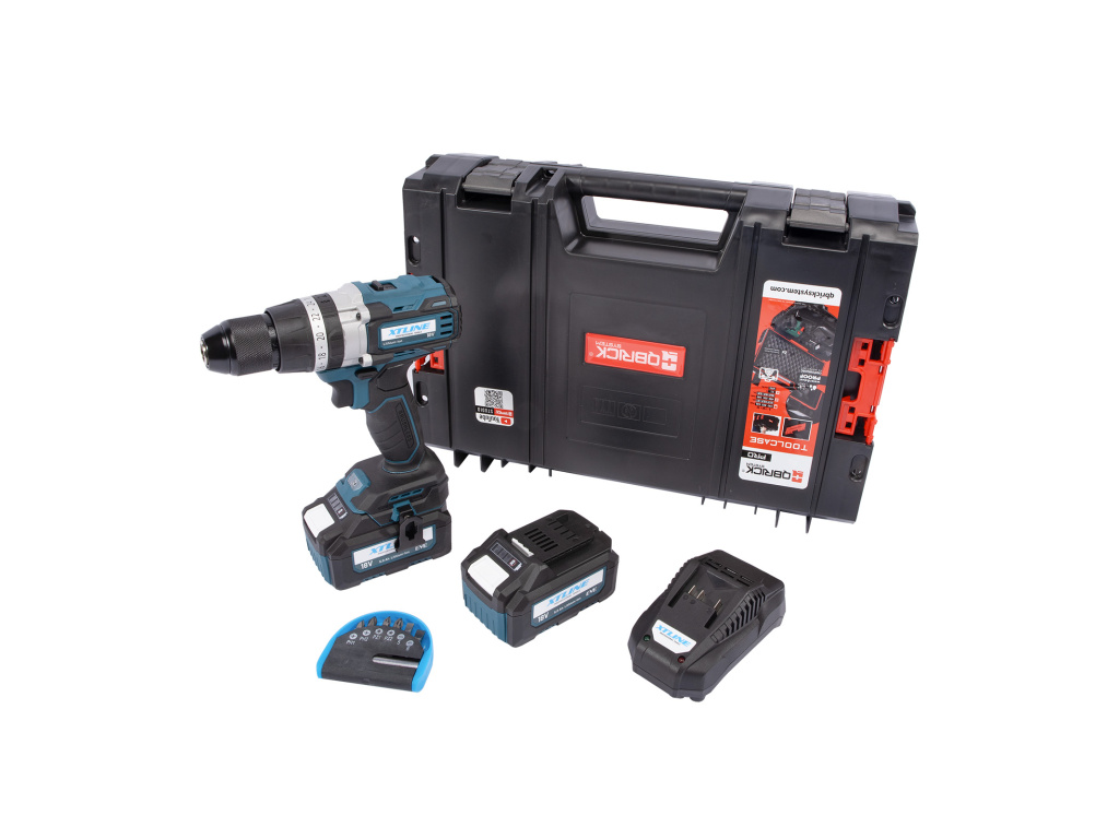 XTLINE Aku vrtačka s příklepem bezuhlíková 18 V, 70 Nm + 2 baterie 5.0 Ah + nabíječka 3.5 A + box