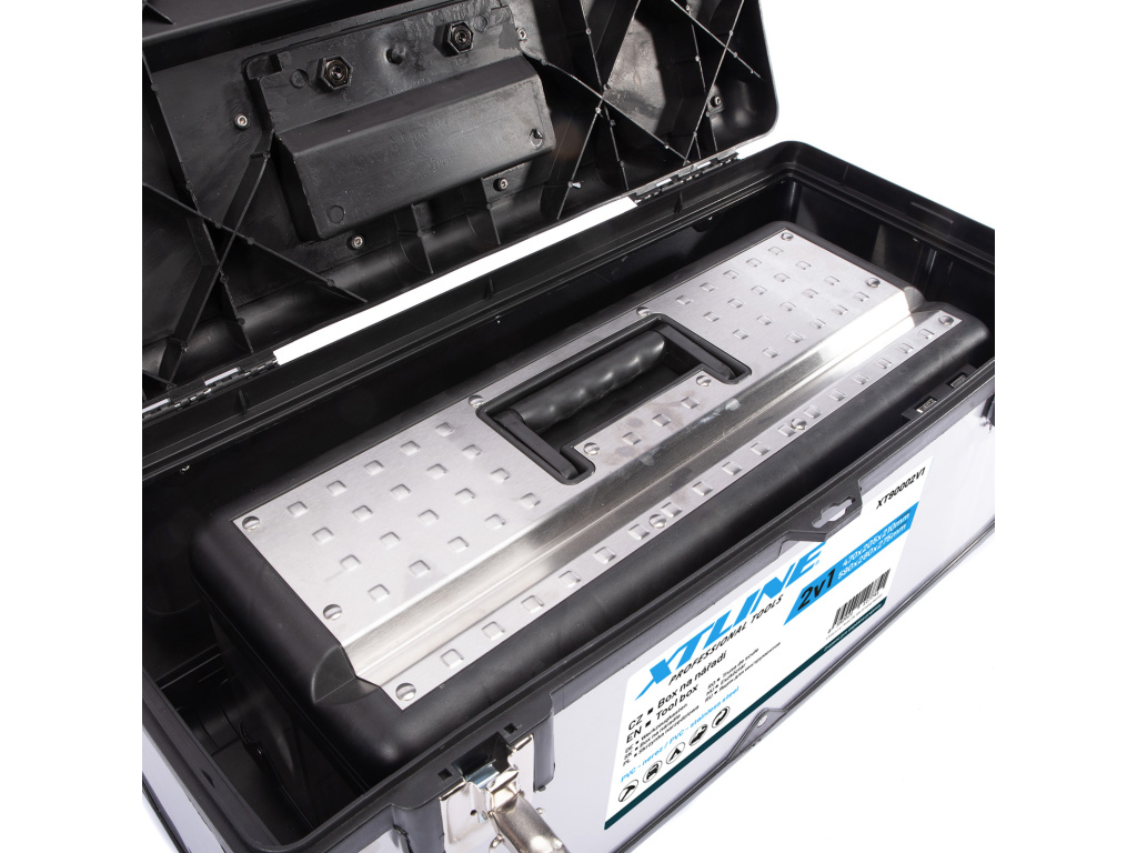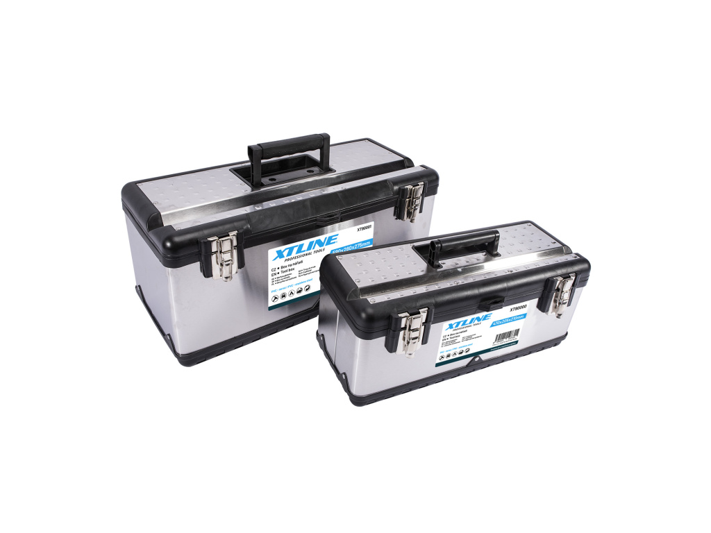 Profesionální box na nářadí v kombinaci plastu a nerezu. Pevný a odolný pro vysokou zátěž, je možné jej použít i jako stupínek (max. 100 kg). Kovové přezky a oko na uzamčení visacím zámkem. Žlábek pro zakládání trubek a latí při řezání. Obsahuje box XT90000 a XT90001.