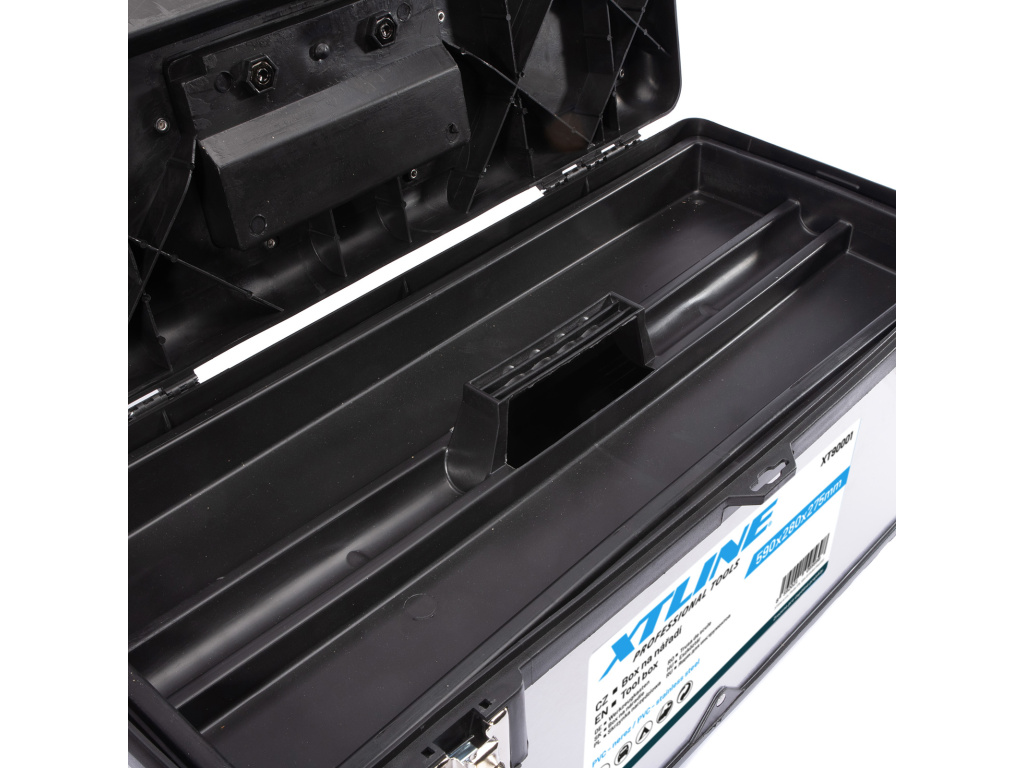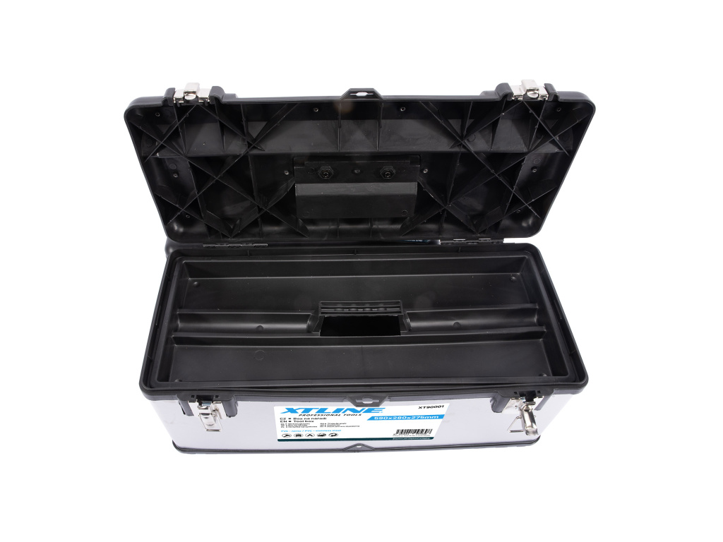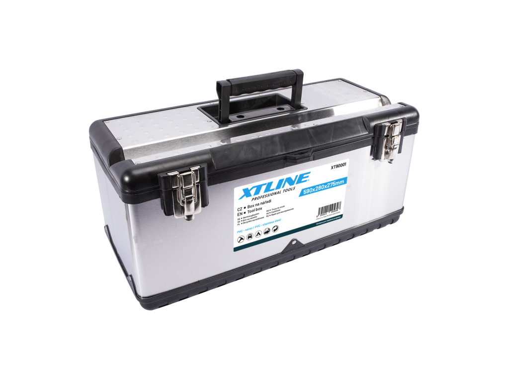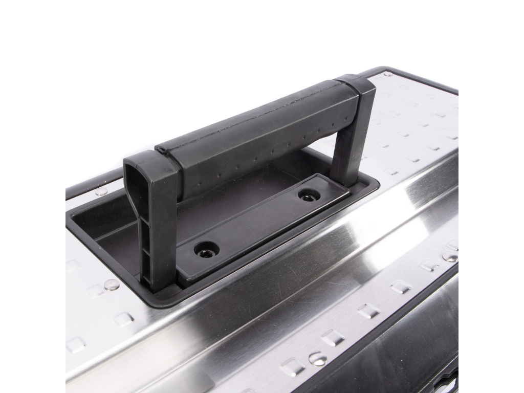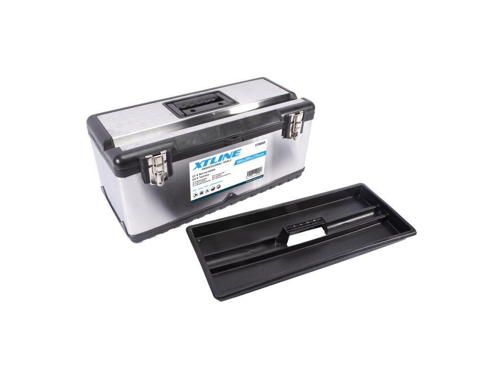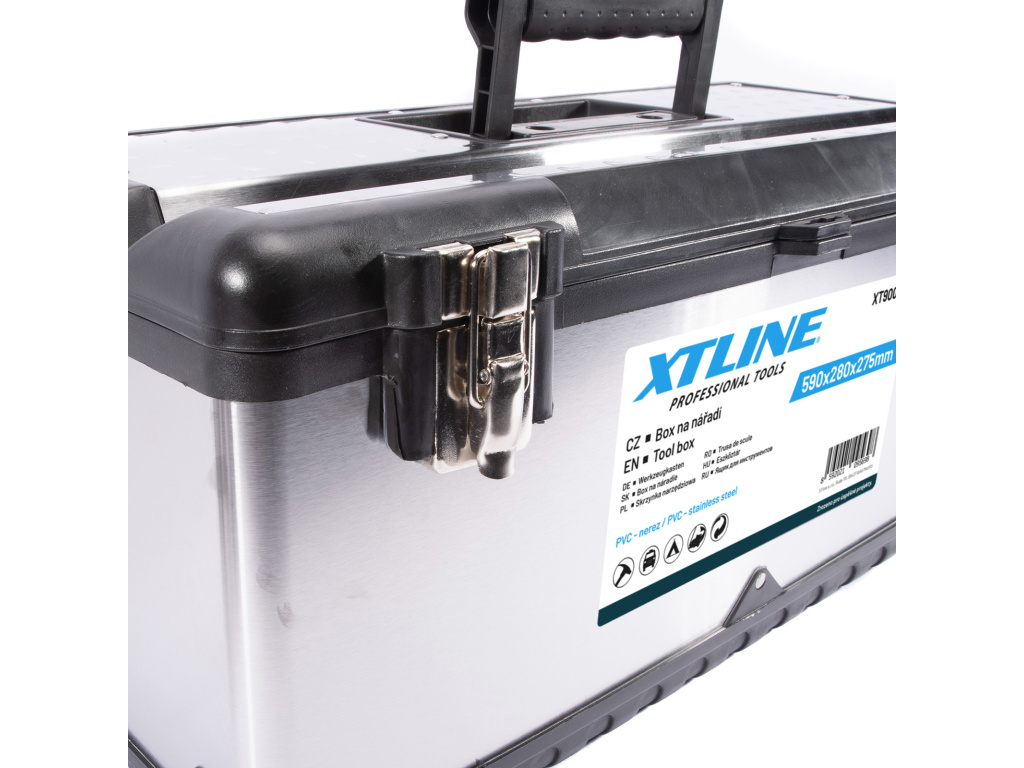 Profesionální box na nářadí v kombinaci plastu a nerezu. Pevný a odolný pro vysokou zátěž, je možné jej použít i jako stupínek (max. 100 kg). Kovové přezky a oko na uzamčení visacím zámkem. Žlábek pro zakládání trubek a latí při řezání.