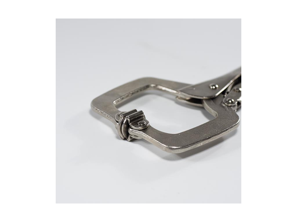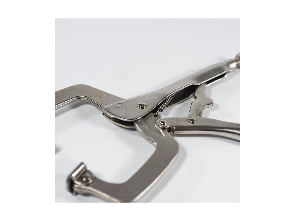 Kvalitní samosvorné kleště pro svářeče, klempíře či zámečníky, s čelistí ve tvaru C. Kloubové koncovky čelistí. Ovládací šroub pro nastavení tloušťky materiálu. Páka pro rychlé odjištění. Kleště jsou vyrobeny z kvalitní chrom molybdenové slitiny oceli CrMo.