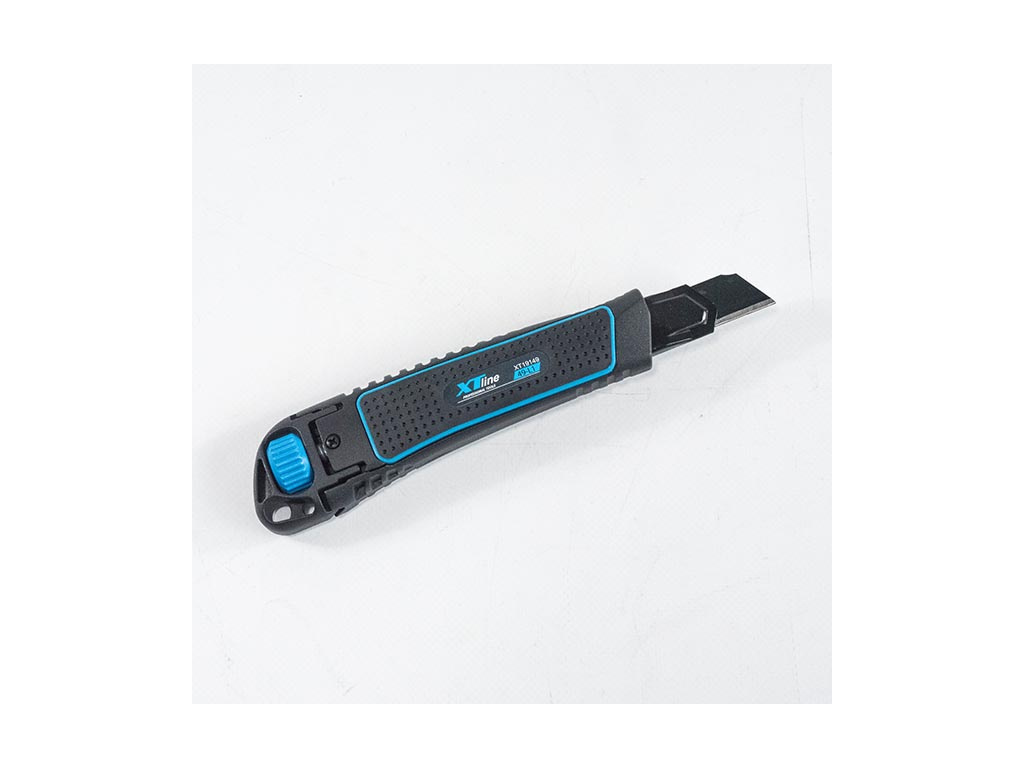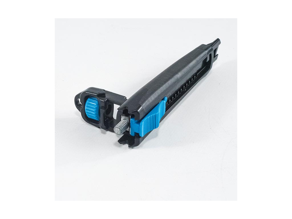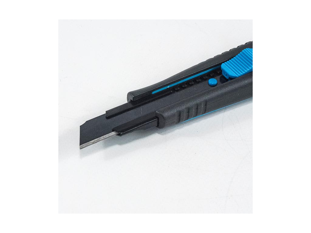 Celokovový ulamovací nůž s pogumovanou rukojetí a vodící lištou. Ocelové vodítko čepele se vždy automaticky uzamkne proti pohybu. Šroubová aretace na zadní straně. Nůž má mezinárodní patent na aretaci břitu pro větší bezpečnost. Černěný povrch odolný proti korozi.