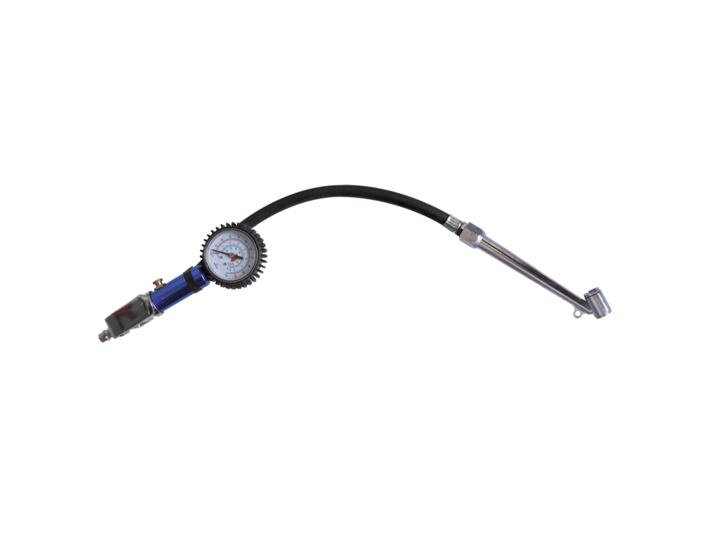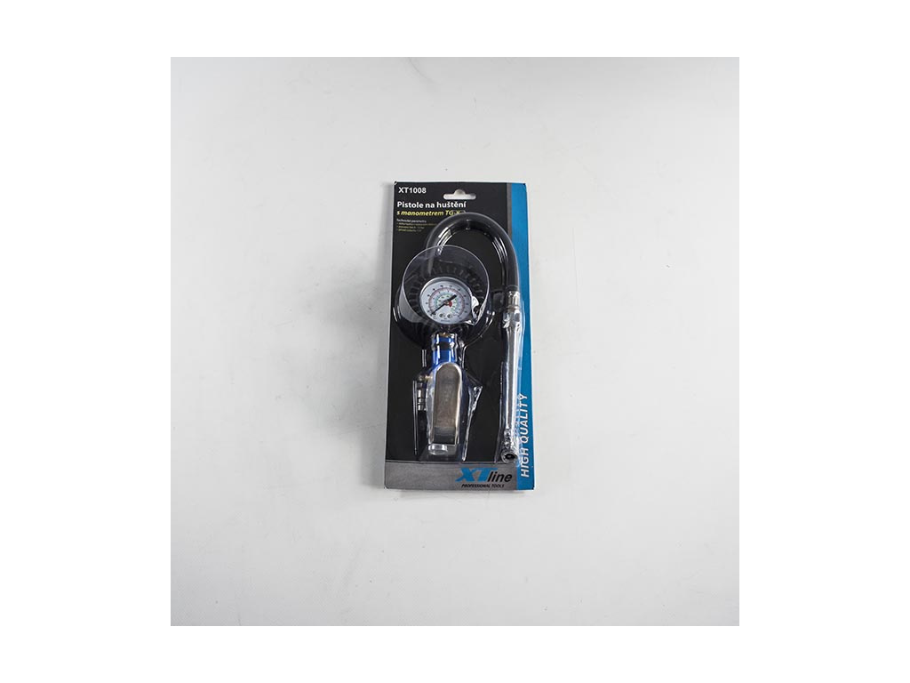 Pistole na huštění pneumatik s manometrem, odpouštěcím ventilem a připojením pro rychlospojku.