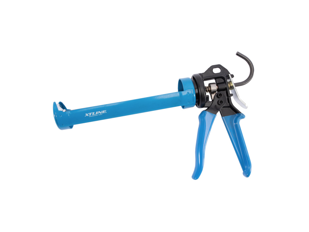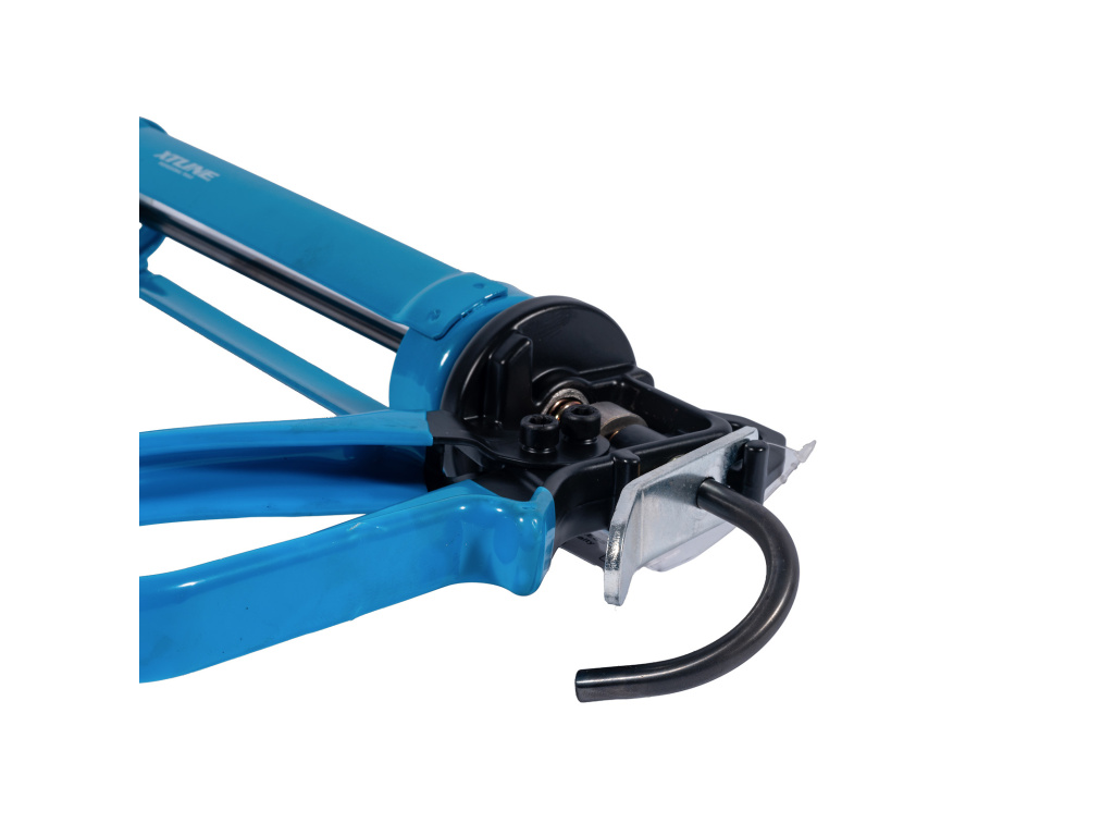 Výkyvná vytlačovací pistole na tmel. Robustní konstrukce a zesílený pojezdový mechanismus umožňuje aplikaci bez prokluzu vodící tyče. Dripless funkce umožňuje okamžitě po uvolnění ovládací páky zastavení vytlačování materiálu. Pevný kovový rám je odolný proti kroucení.