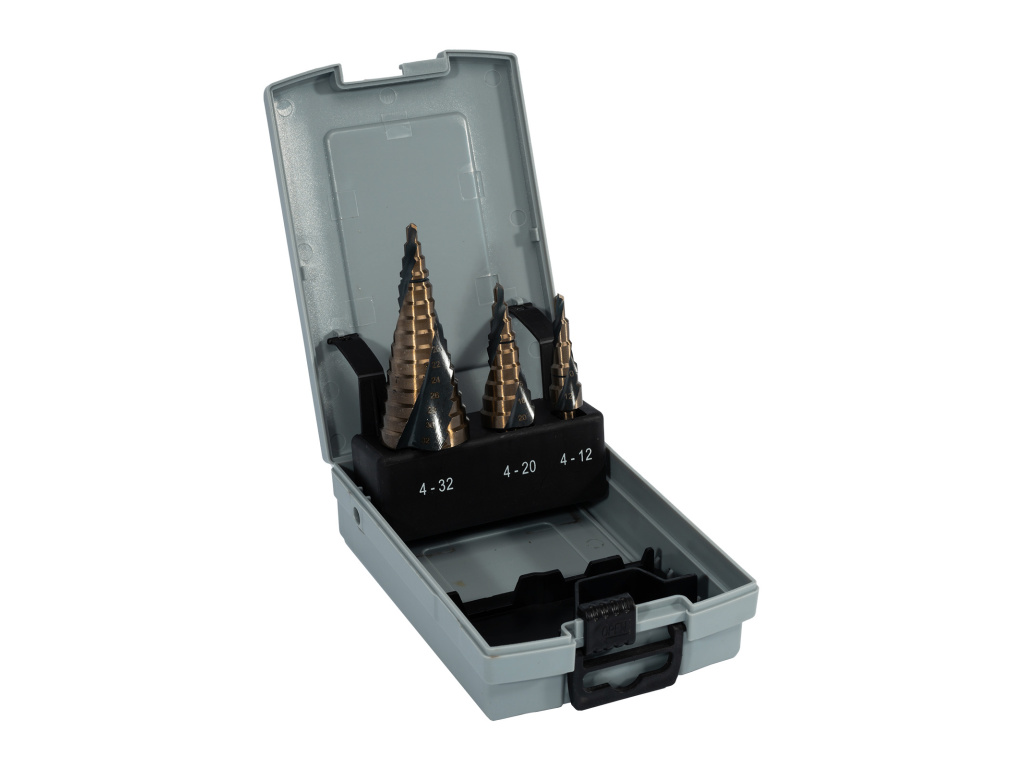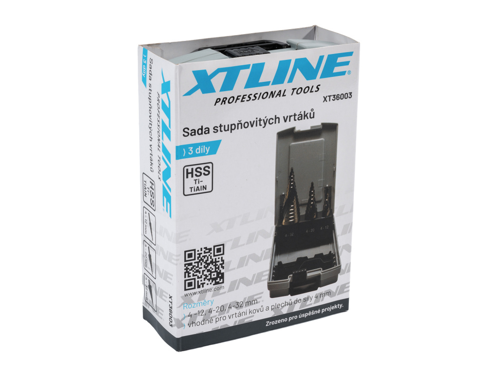 XTLINE Sada stupňovitých vrtáků HSS TiN-TiAIN 3 díly | 4-32 mm, plastový obal